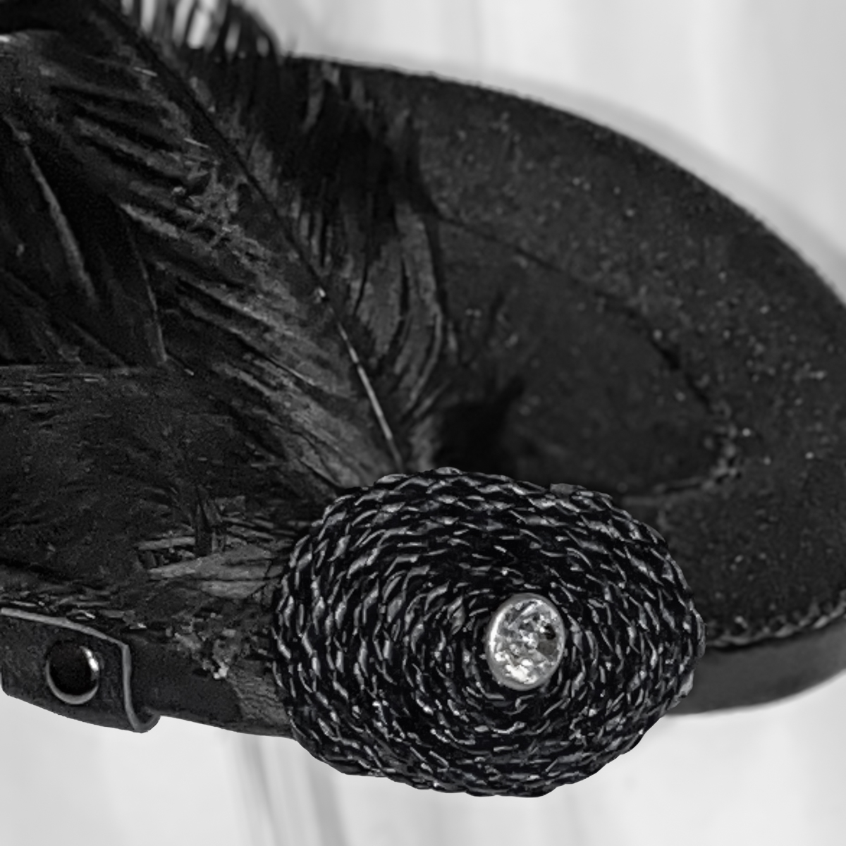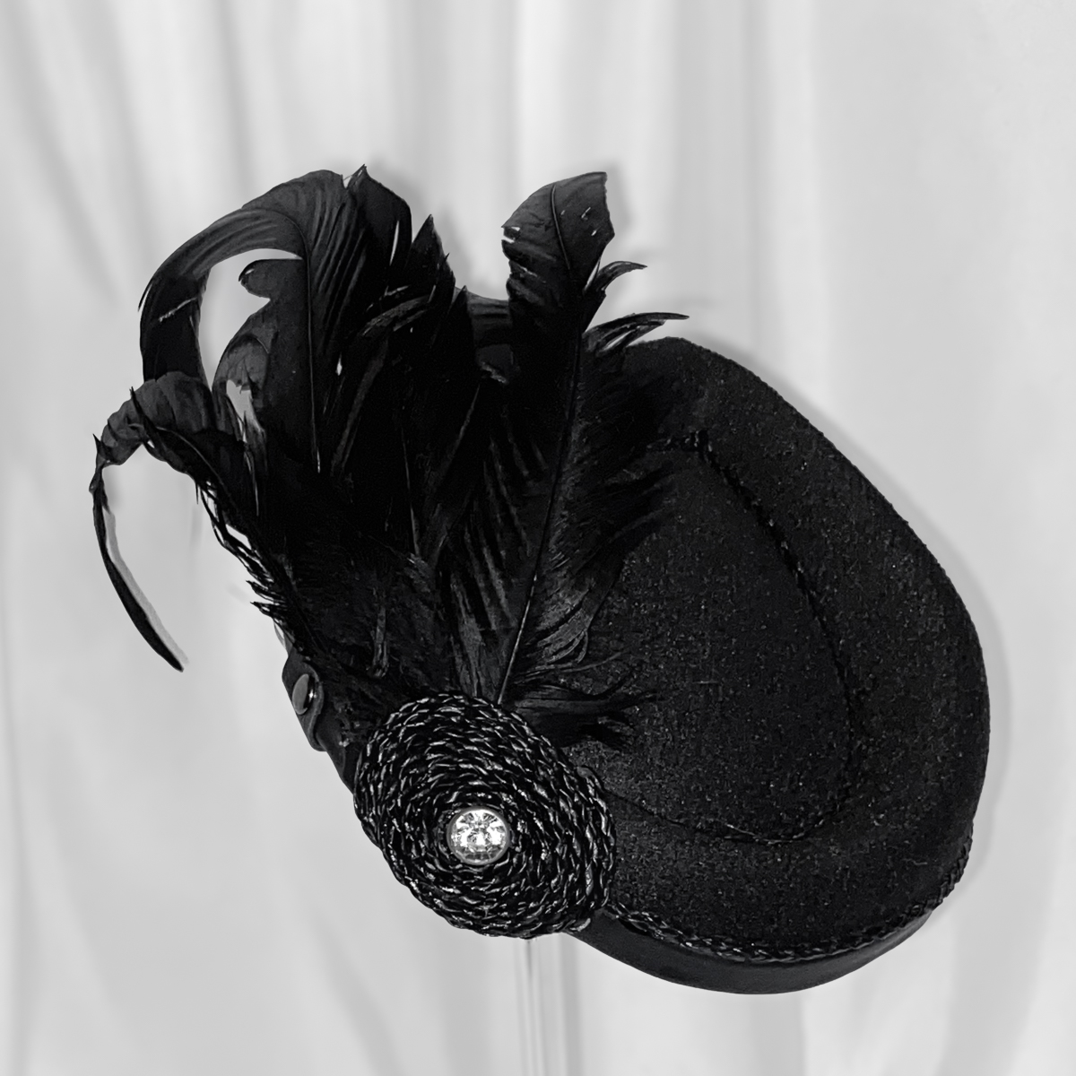 At the base, a woven black rosette anchors the piece, finished with a subtle crystal center that adds just the right touch of light and refinement. The structured black base provides balance and stability, making this fascinator ideal for formal events, cocktail attire, styled photoshoots, or moments when a powerful finishing touch is needed. Sophisticated, dramatic, and unapologetically bold, this piece embodies couture flair.