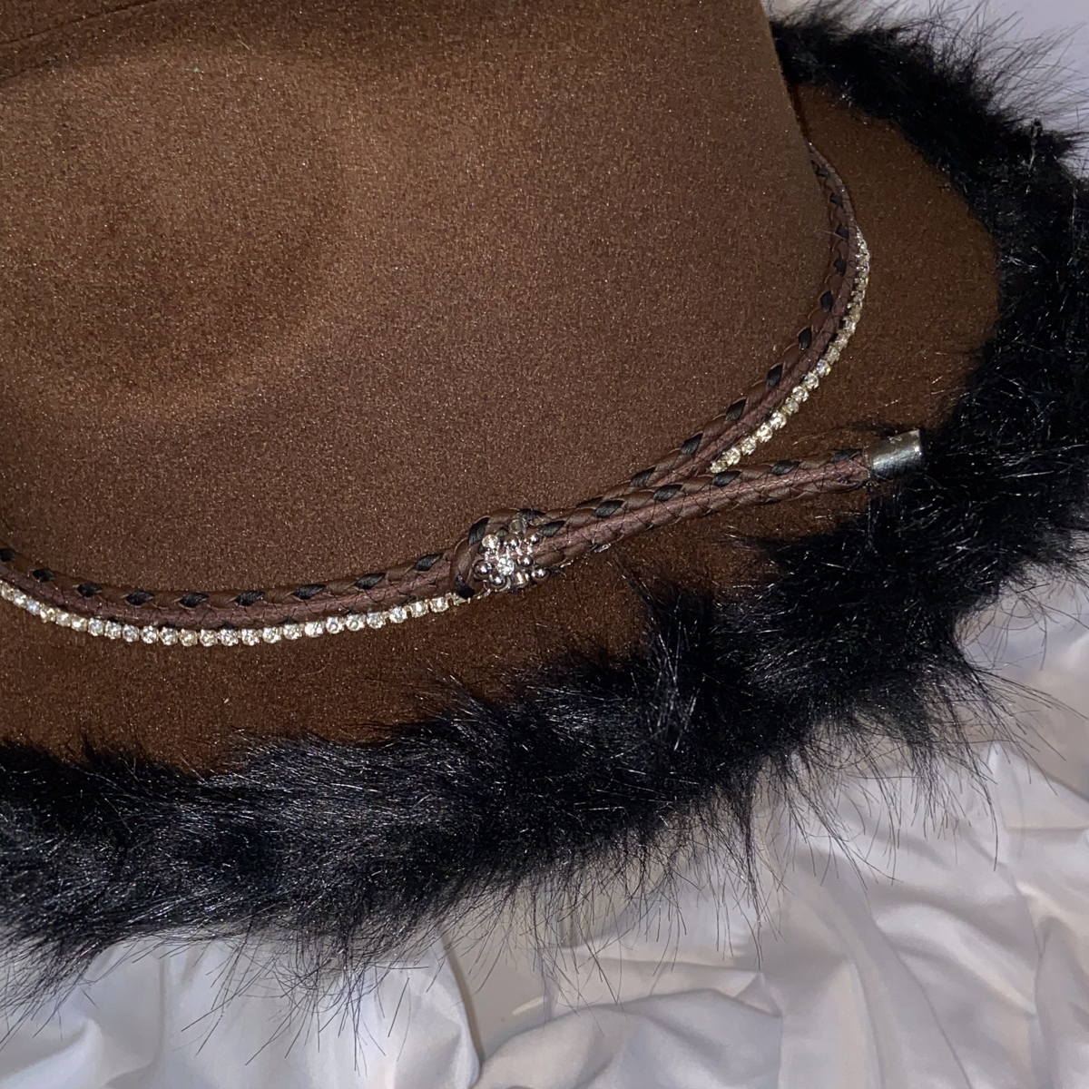 The crown is accented with layered band details, including a braided trim and a sparkling rhinestone band that wraps gracefully around the hat. A subtle rhinestone accent at the side completes the look, creating balance between rugged texture and refined shine. This piece is bold yet versatile—perfect for elevating everyday outfits, statement styling, or fashion-forward occasions.