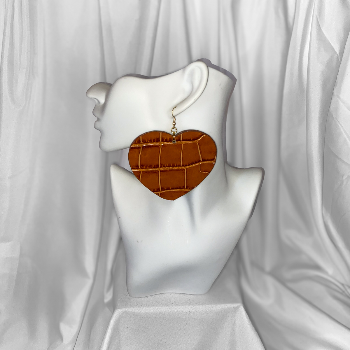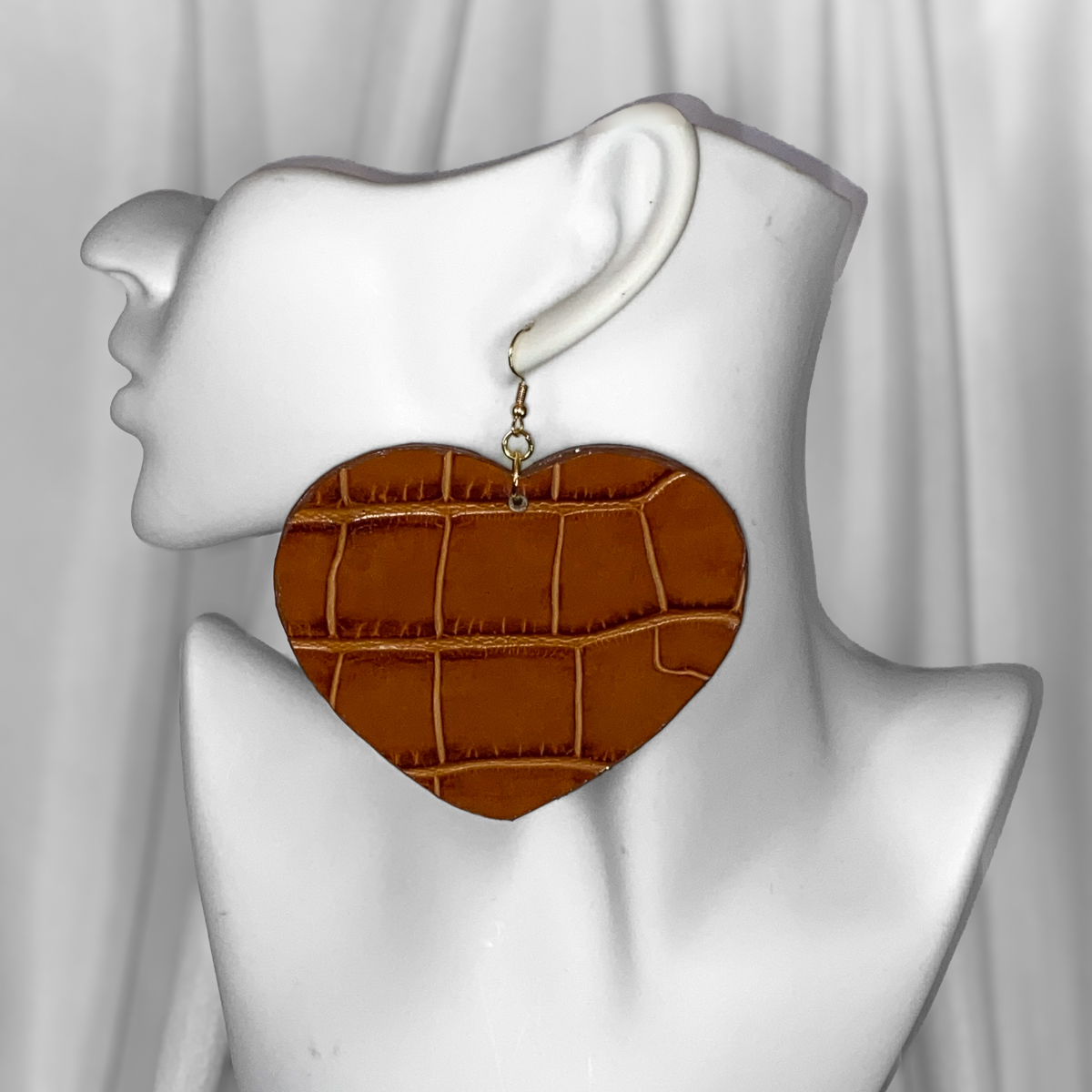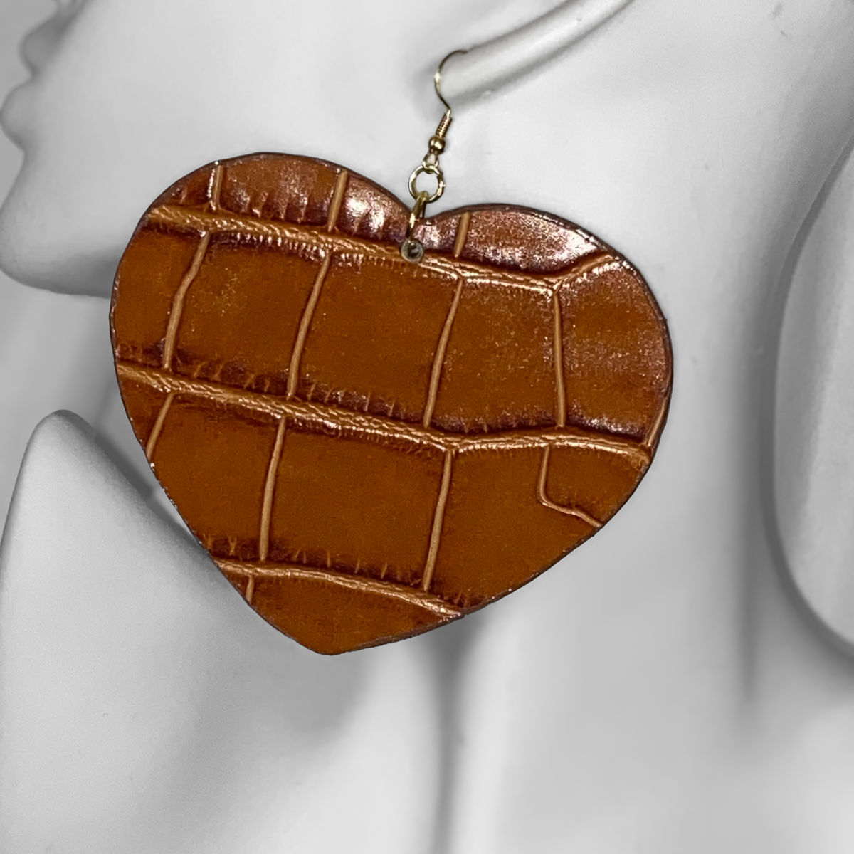 These cognac croc-embossed earrings bring warmth, texture, and understated edge to a statement silhouette. Designed with a heart-shaped, rich brown surface detailed with a croc-style embossed pattern that adds depth and visual interest without overpowering the design.