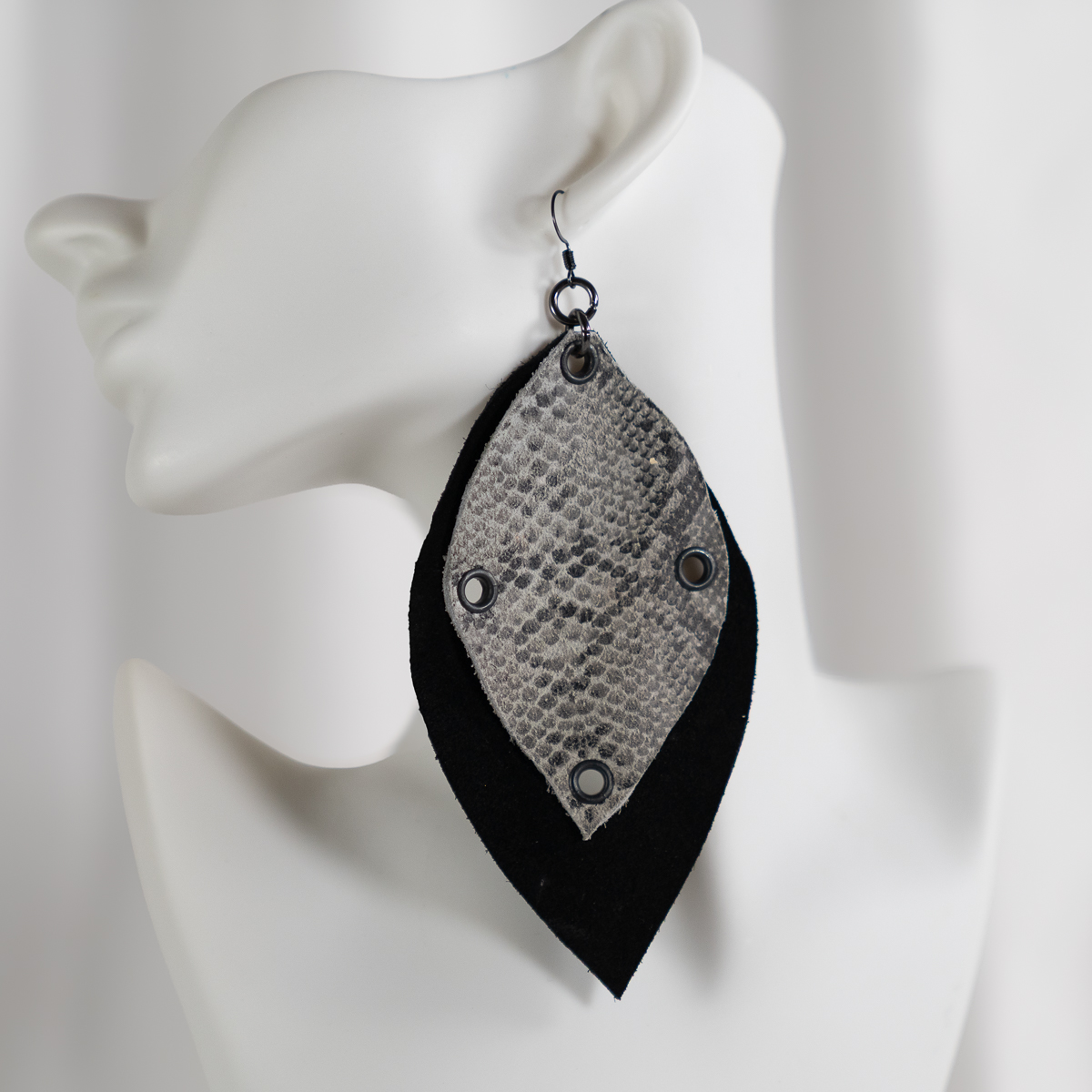 These statement earrings combine a textured genuine leather snakeskin overlay with a smooth black suede backing, creating a layered leaf silhouette that feels both modern and timeless. Finished with understated grommet accents, the design balances structure with organic movement.