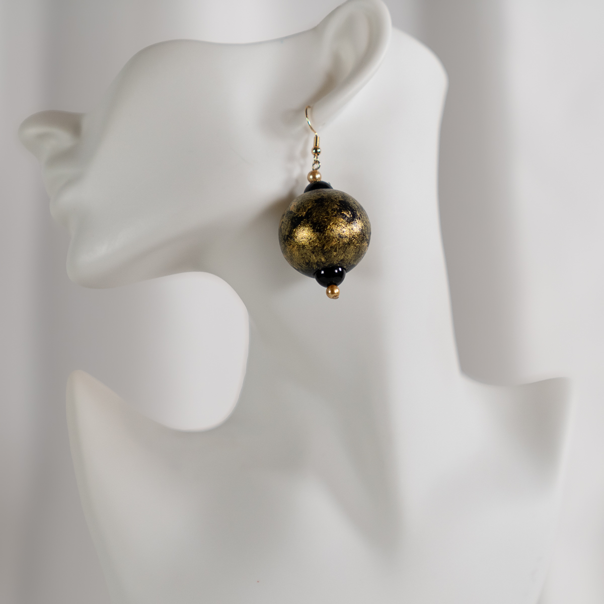 The Golden Sphere Earrings are a study in bold simplicity. A large, textured metallic gold sphere takes center stage, reflecting light with a rich, luminous finish. Black accent beads and gold-tone spacers provide contrast and balance, creating a refined yet impactful silhouette.