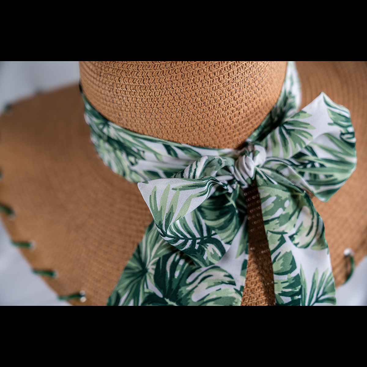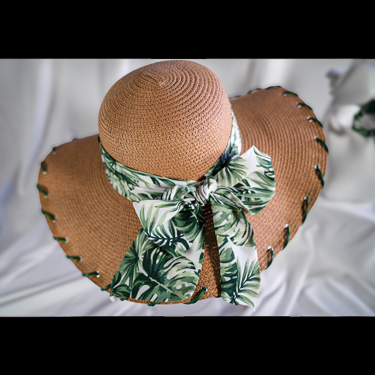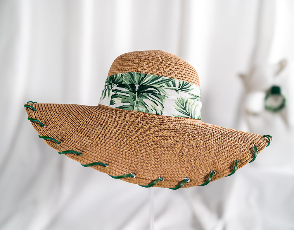 The brim is finished with hand-laced green detailing, creating subtle contrast and highlighting the craftsmanship behind the design. Lightweight and breathable, this piece offers comfortable sun coverage while elevating any casual, vacation, or outdoor look.