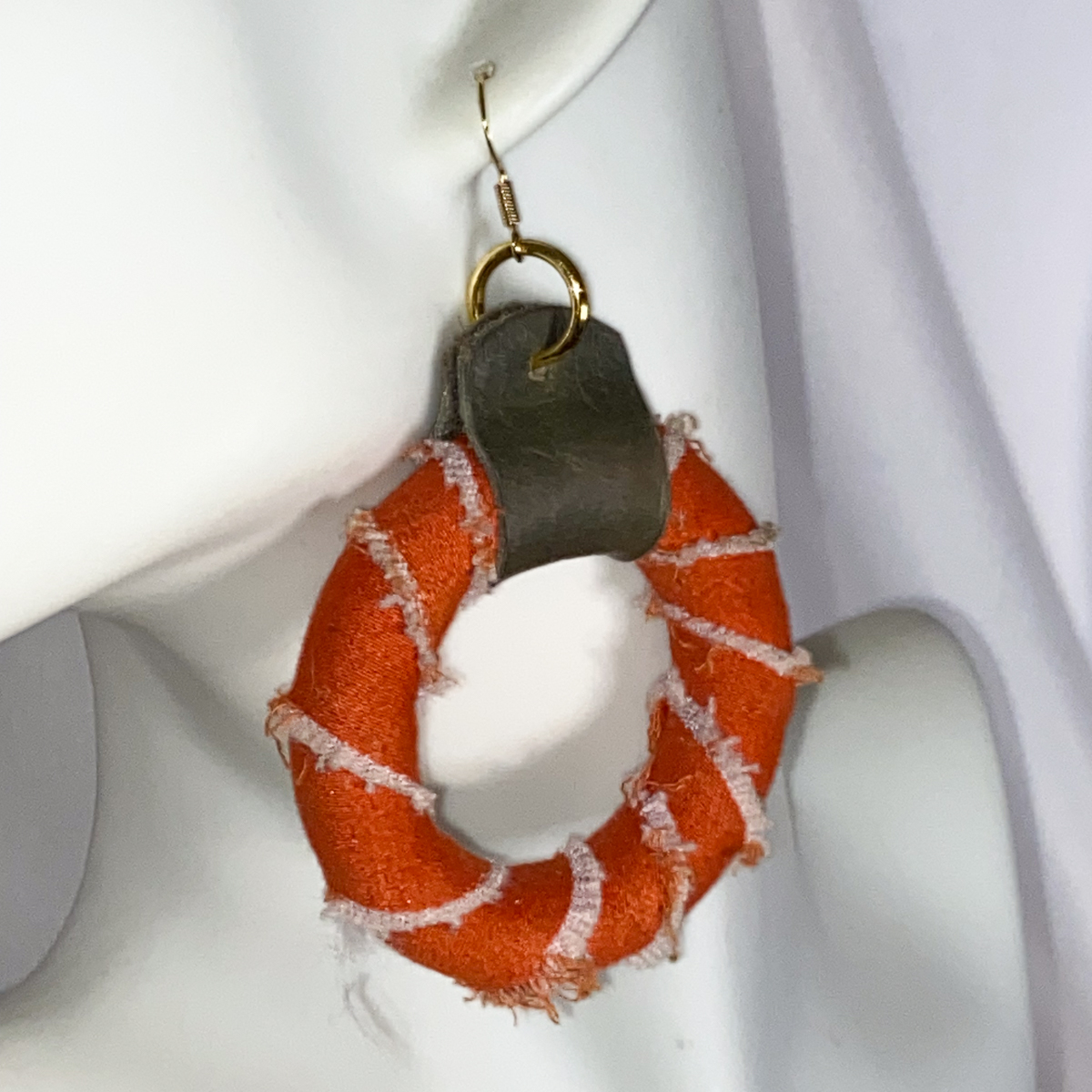 These statement earrings celebrate texture, contrast, and handcrafted character. Designed with a circular ring wrapped in rich orange fabric, the exposed stitching and frayed edges add depth and visual interest, giving the piece a relaxed, artisanal feel. A muted-toned top accent and gold-tone connector complete the look, balancing softness with structure.