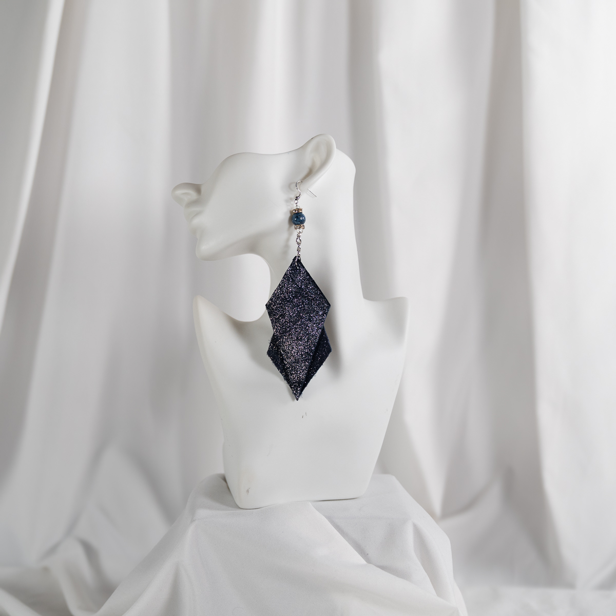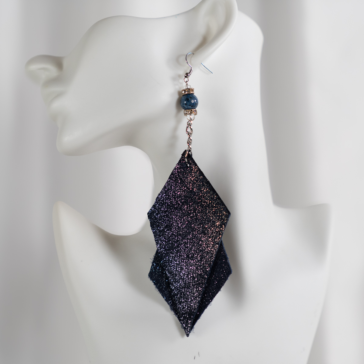 The Midnight Prism Layered Drop Earrings are designed to move with light and intention. Featuring a dramatic layered silhouette, these earrings showcase shimmering black fabric that subtly shifts with hints of violet and midnight sparkle. A polished blue stone bead adds contrast and balance, framed by metallic spacers and suspended from a delicate silver-tone chain.