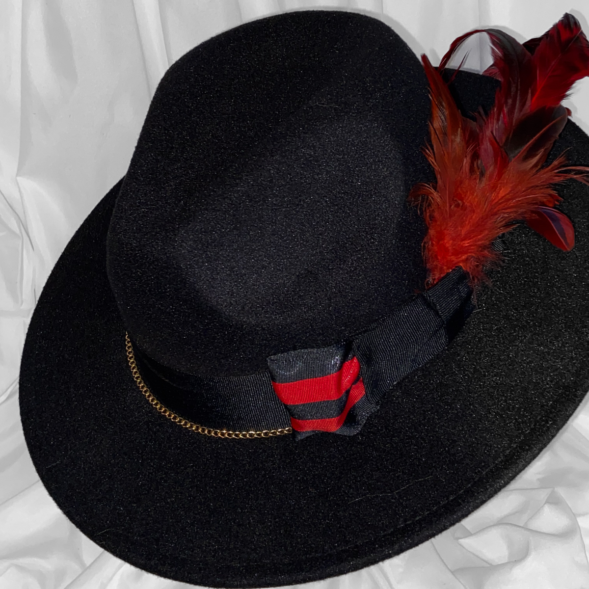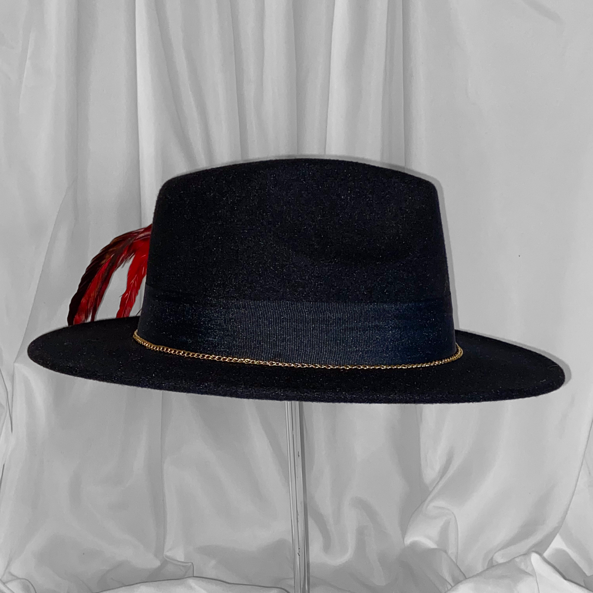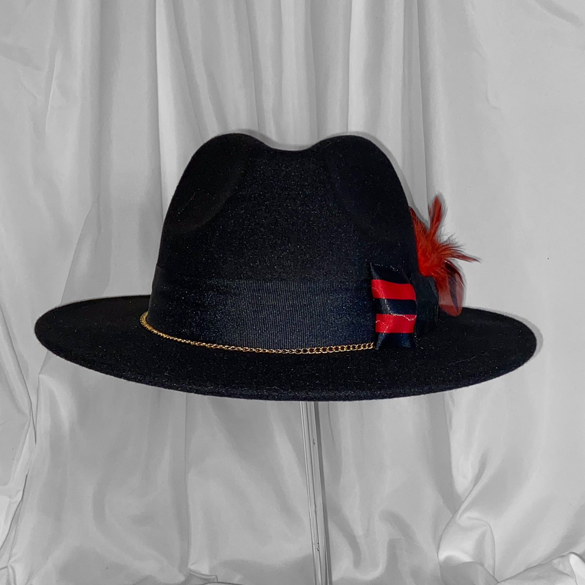 The design is further elevated with a layered hat band that includes a red-and-black striped ribbon detail and a subtle gold chain accent, adding texture and sophistication. Together, these elements create a bold yet balanced look that feels expressive without being overpowering. This hat is ideal for styling statement outfits, creative looks, or adding personality to a classic ensemble.