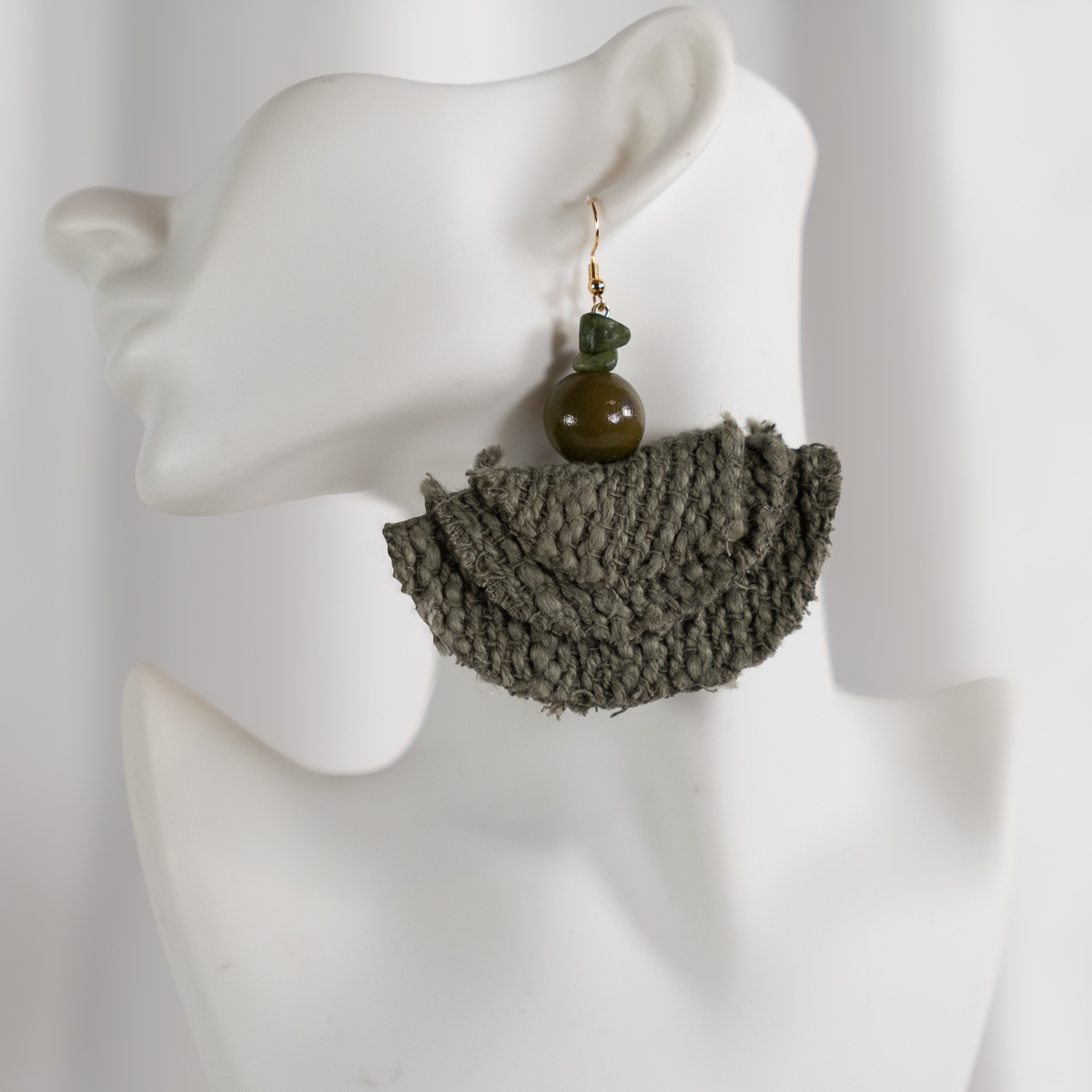 The Olive Grove Woven Statement Earrings celebrate natural texture and grounded beauty. A woven half-moon fabric in a muted olive-gray tone creates a soft yet striking base, complemented by stacked green stone chips and a smooth round olive bead above. Gold-tone hardware adds a subtle touch of warmth and balance.