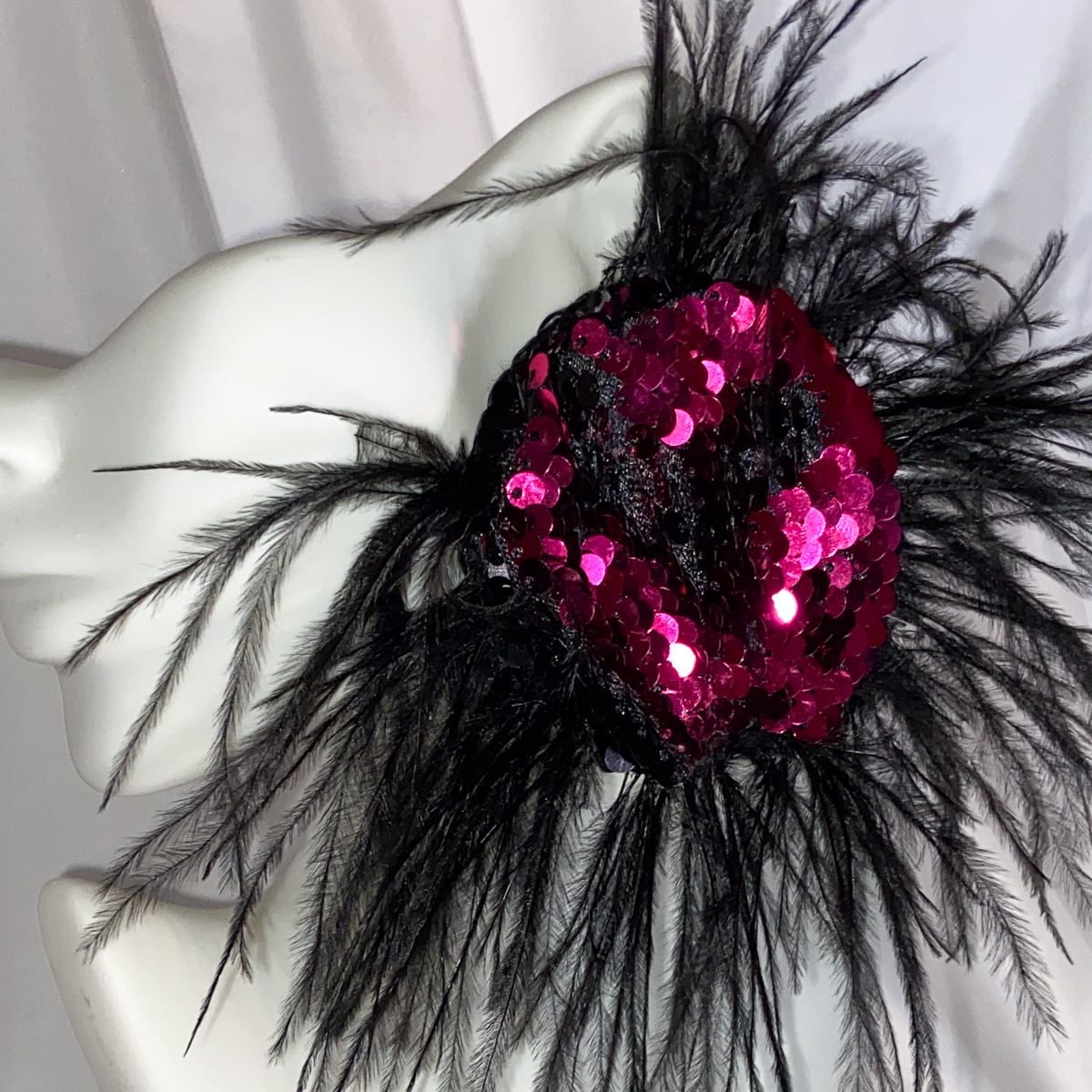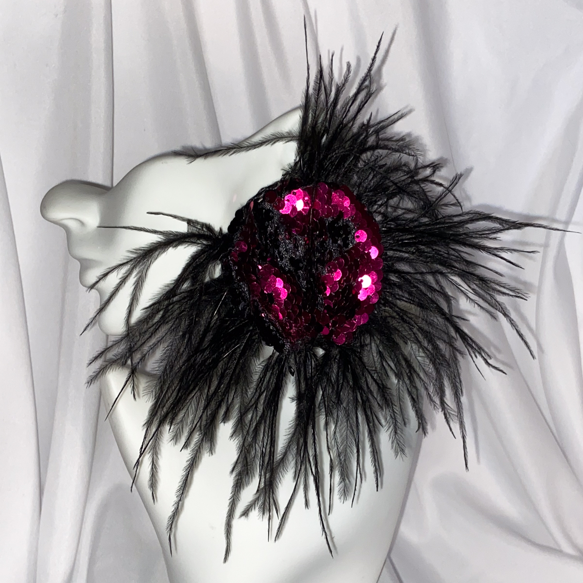 The Party Girl couture earring was made for nights that call for confidence, creativity, and standout style. Designed as a single statement earring, it features a radiant magenta sequin center surrounded by a dramatic burst of black feathers that move with every turn of your head.