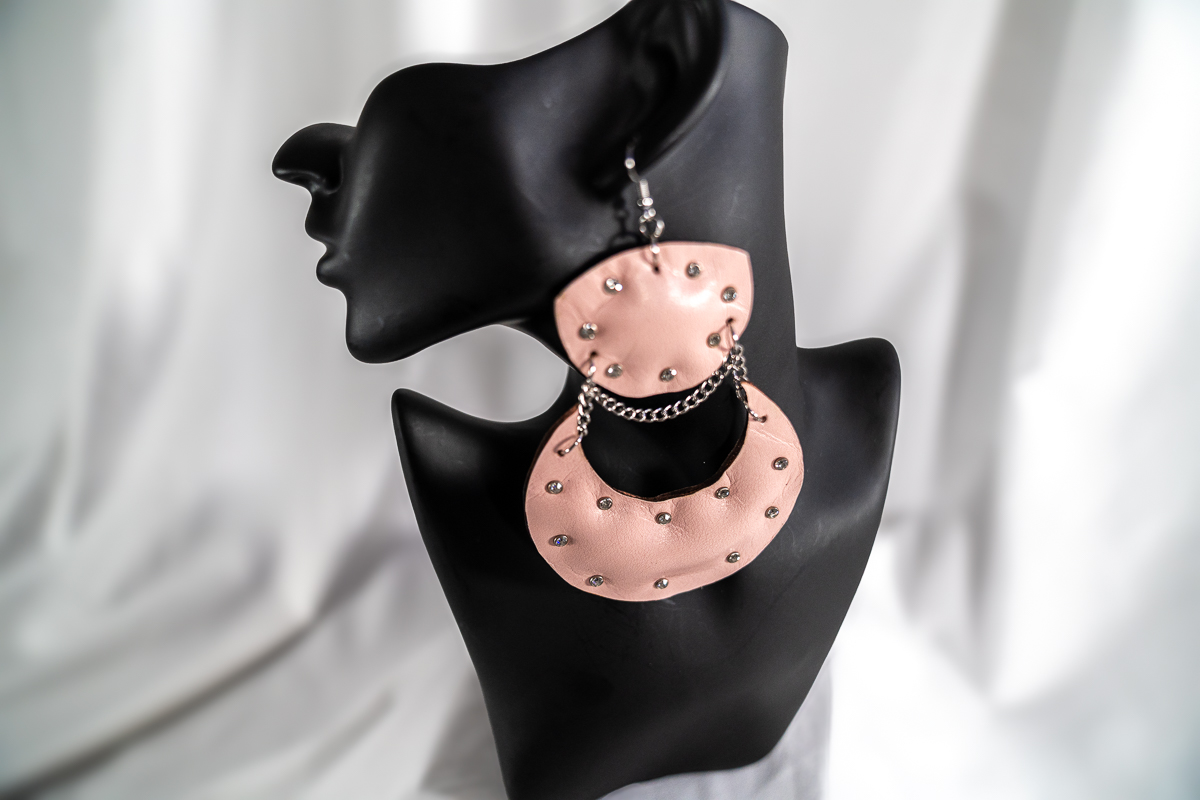The Pretty Puff Pairs Blush Pink Crescent earrings offer a fresh take on statement style. Crafted from genuine blush pink leather, the sculptural crescent silhouette is finished with polished silver-tone stud accents that add subtle texture and shine.
