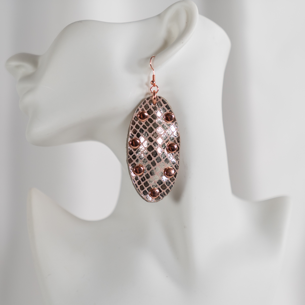 Designed to stand out without overpowering, these handcrafted oval drop earrings feature a faux snakeskin texture layered with warm rose gold tones and finished with polished copper stud accents. The elongated silhouette flatters the neckline while the metallic details add just the right amount of shine.