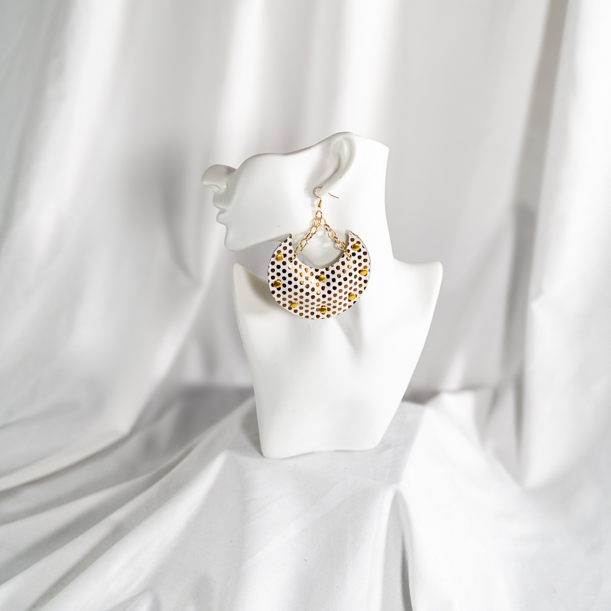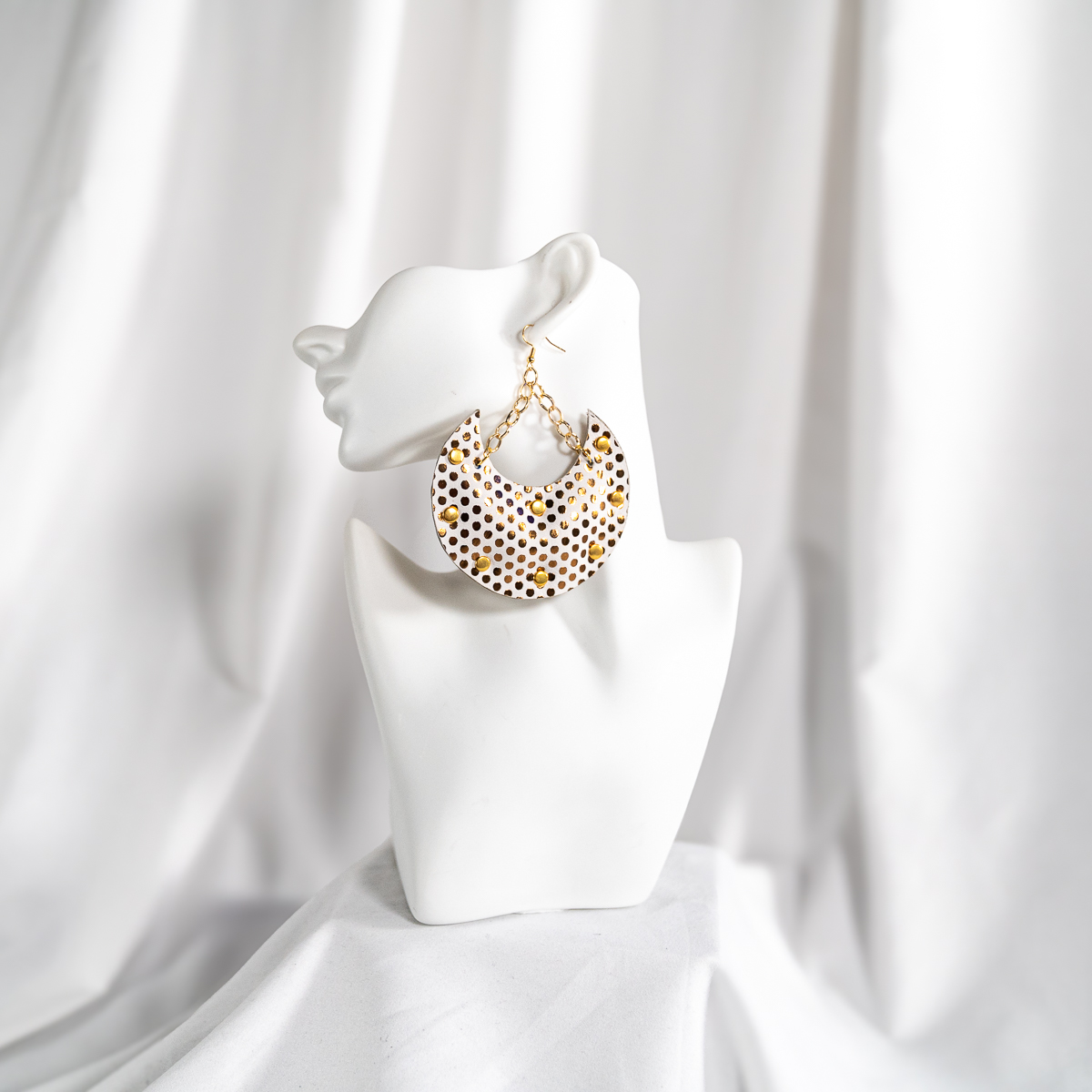 The Pretty Puff Pairs White Crescent earrings offer a refined take on statement style. Crafted from genuine white leather, the crescent-shaped silhouette is accented with polished gold-tone studs that add subtle texture and shine.