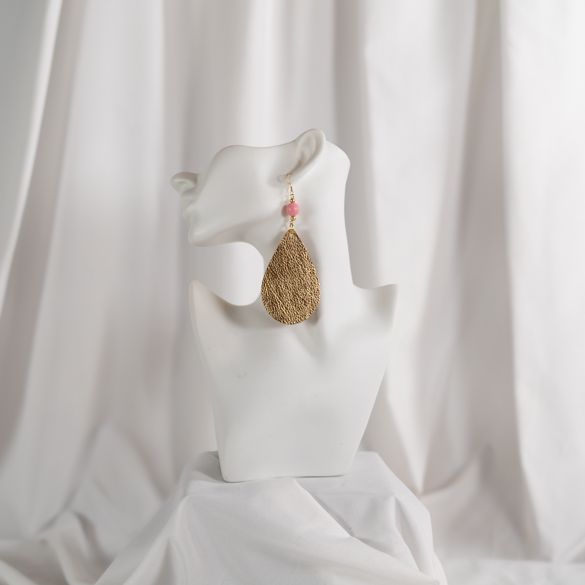 The Soft Rose Metallic Teardrops blend soft color with luminous texture. A metallic leather teardrop in a warm bronze-gold tone creates a graceful, elongated silhouette, while a pink crackle-style bead adds a delicate pop of color above. Gold-tone accents tie the look together with a refined finish.