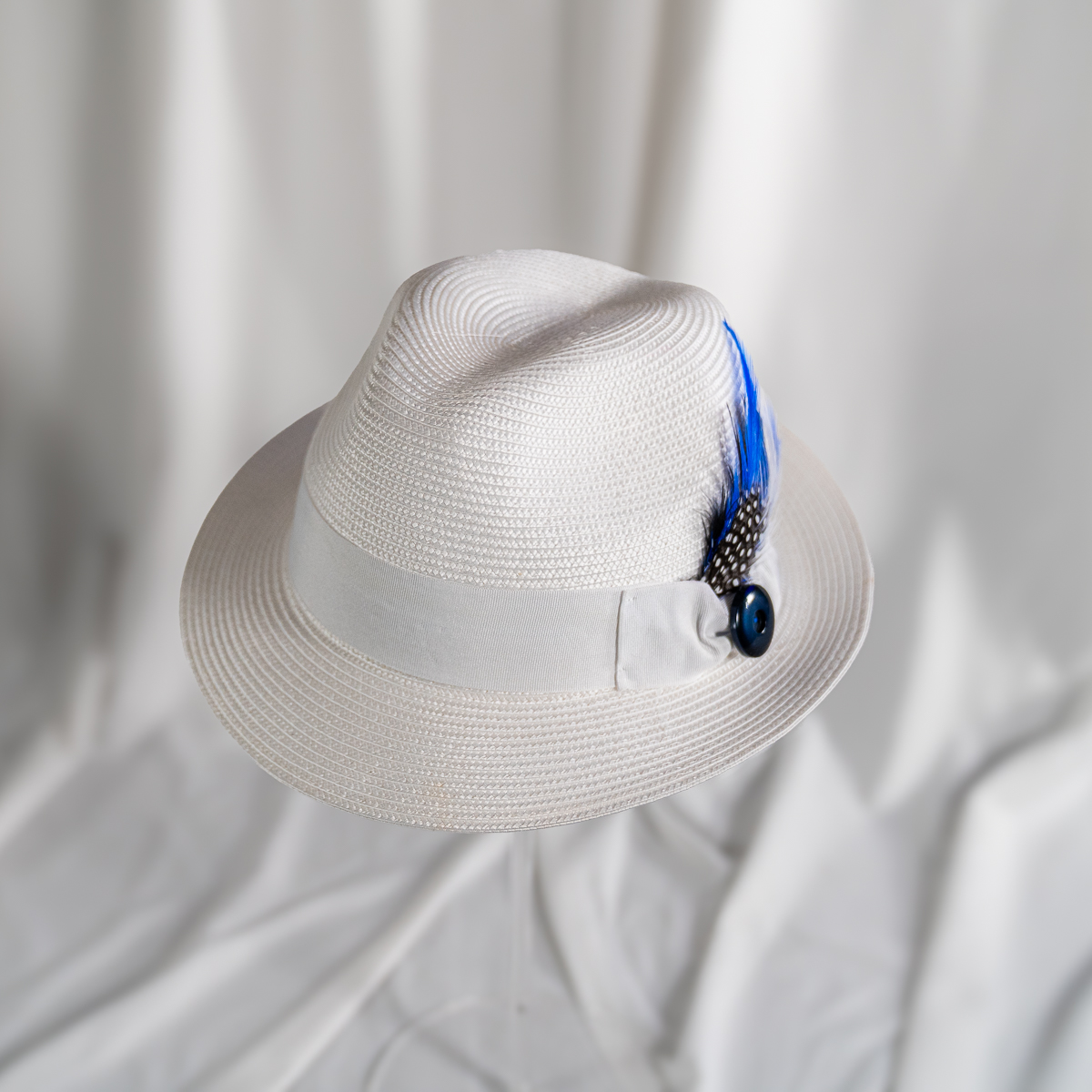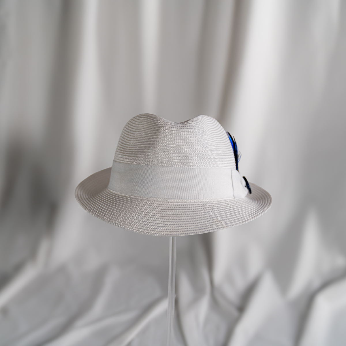 This white straw fedora blends classic structure with bold, artistic detail. Crafted from a finely woven straw material, the hat offers a lightweight yet polished silhouette that works effortlessly across seasons.