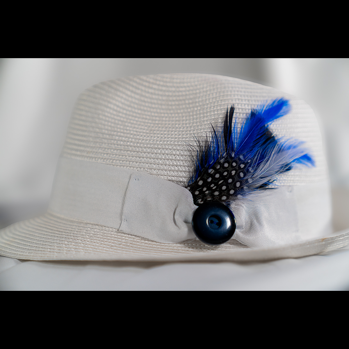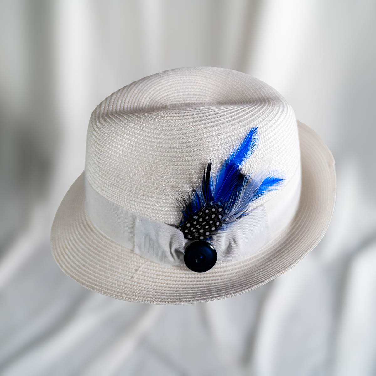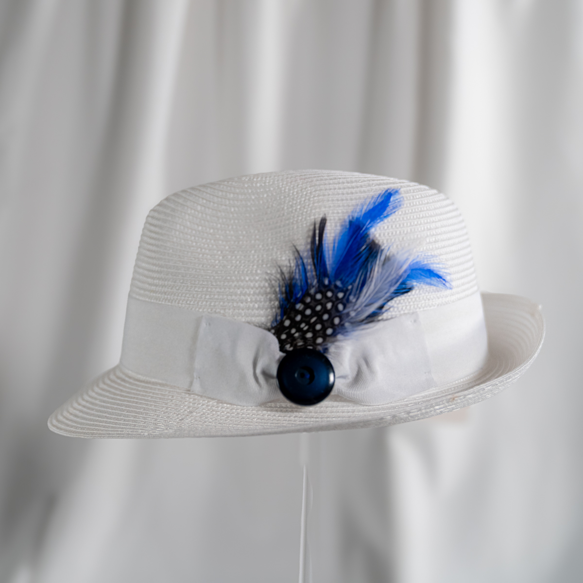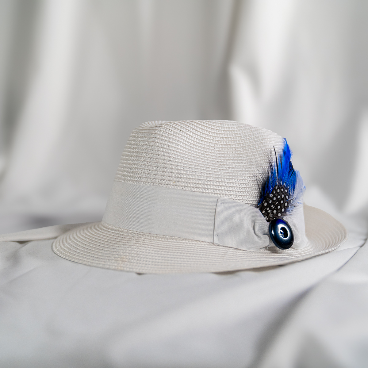 A smooth fabric band wraps the crown, creating a clean foundation for the statement embellishment: a layered feather accent featuring rich blue tones, contrasting textures, and a button detail that adds depth and character. The combination feels intentional and refined rather than ornate.