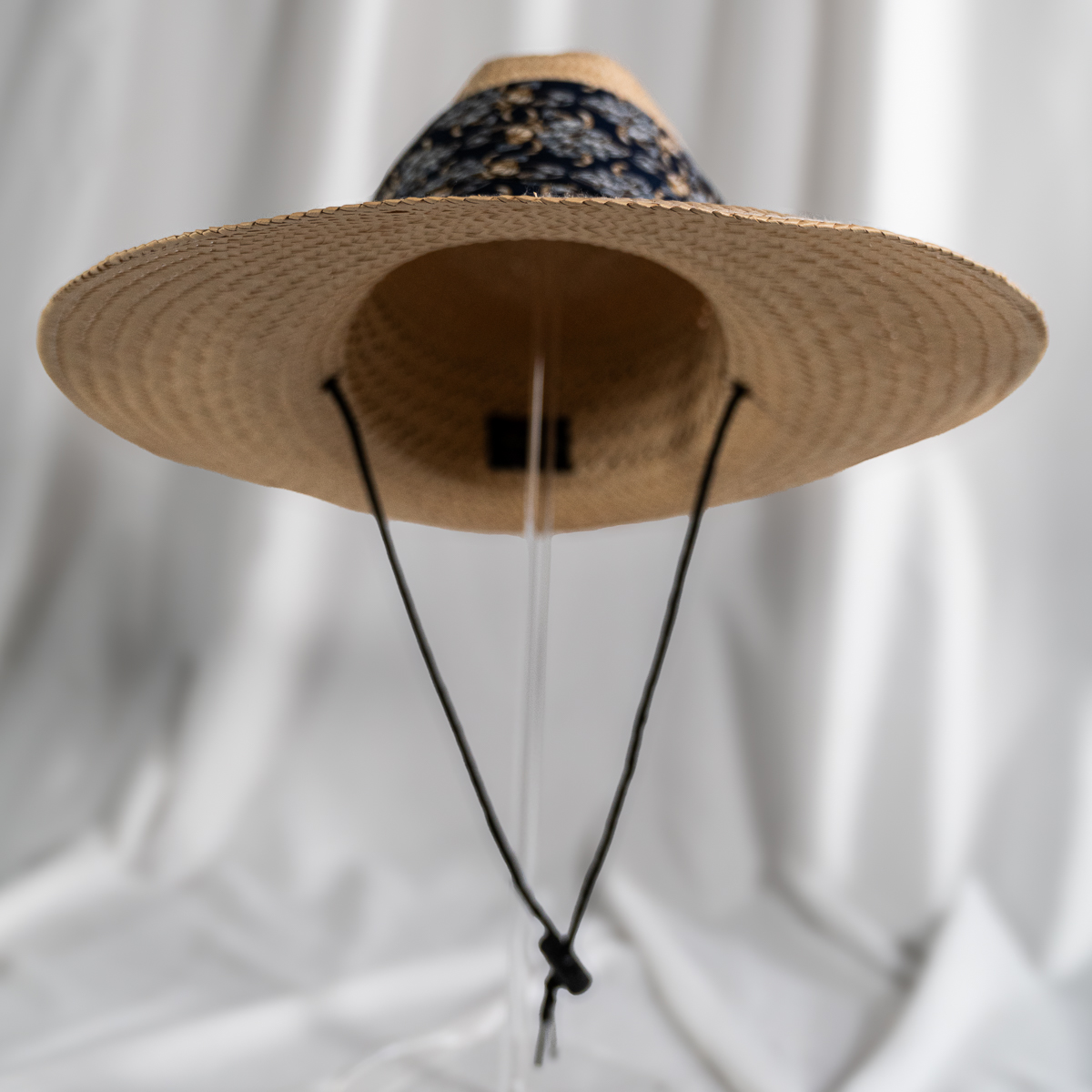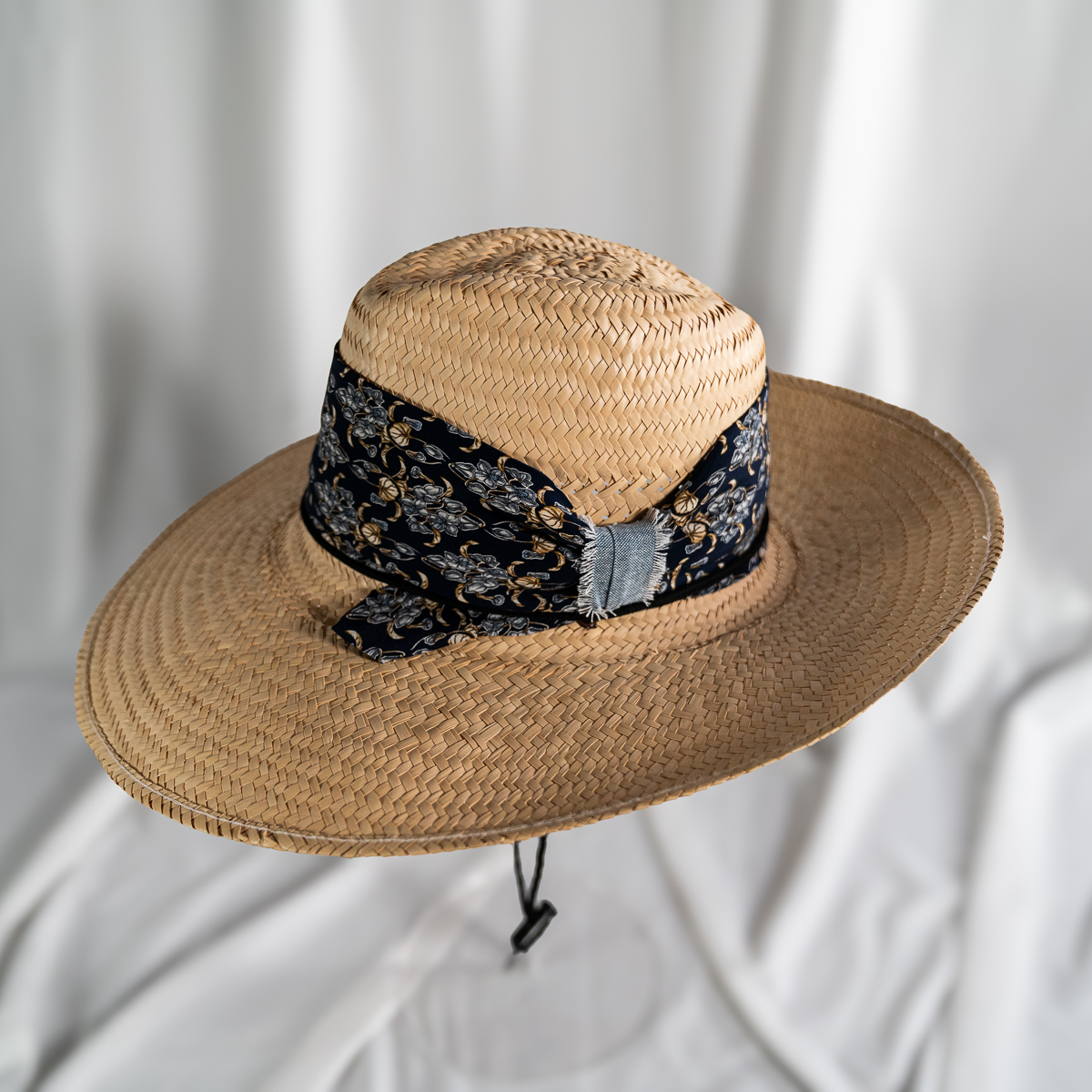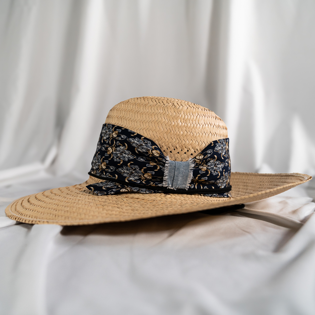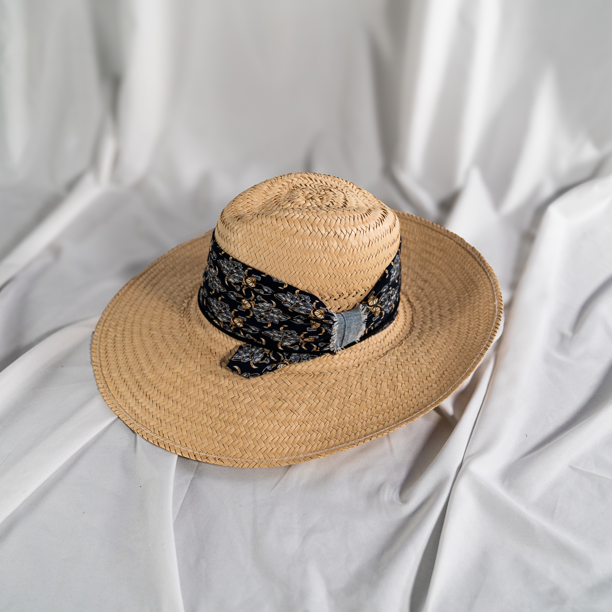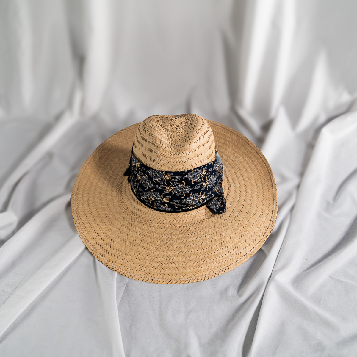Floral-patterned fabric band wrapped around the crown